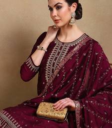 Burgundy color embroidered silk blend styles kurta palazzo with dupatta