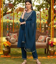 Teal color embroidered silk blend styles kurta trouser with dupatta
