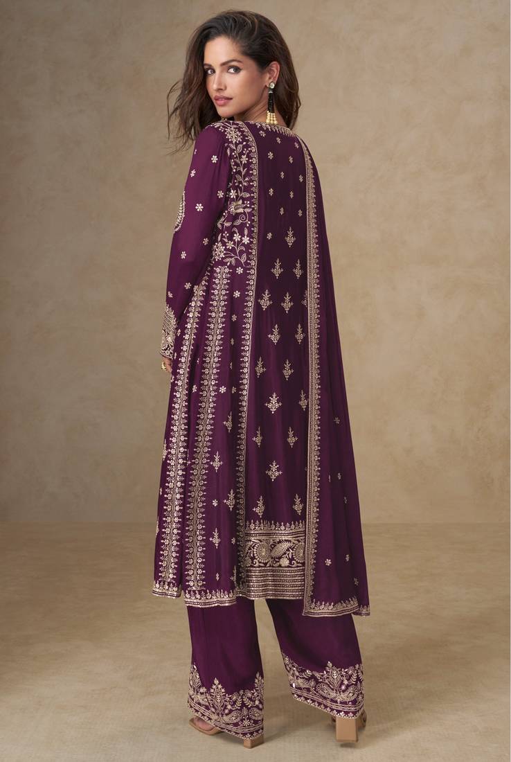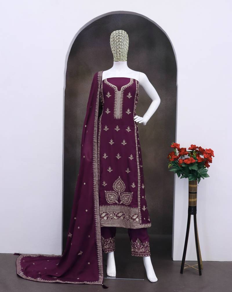 Dark purple chinon silk semi stitched suit with embroidery & sequence work