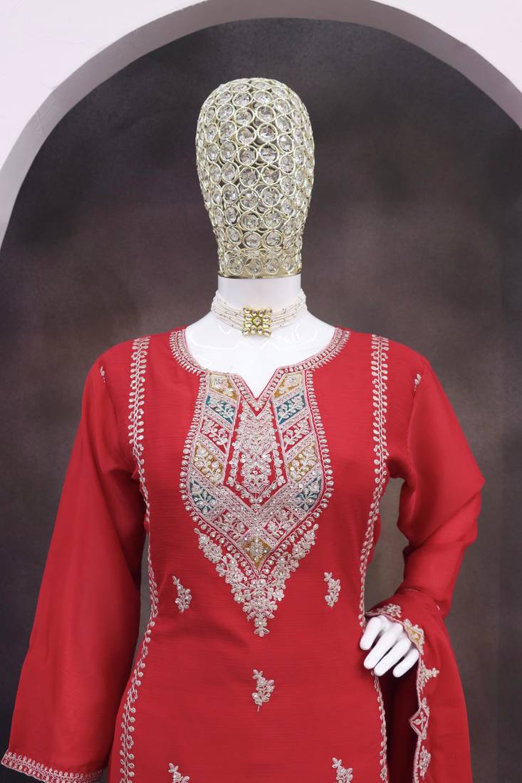 Red heavy chinon reaymade suit with embroidery & sequence work