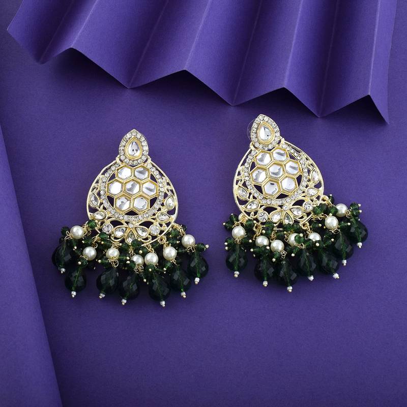 | Product Description | Earring Length: 7.50 Cm X Width: 3.70 Cm | Metal: Alloy With Good Quality Gold Plated | Color: Green | Stone: Kundan & Imitation Pearl | Gross Weight: 48.00 Grams | Package Content: 1 Pair Of Earrings | Back Finding: Post With Friction Back X Earring Style: Dangle |