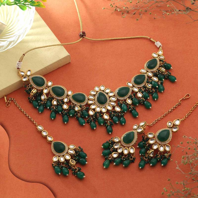 | Product Description | Adjustable Rope | N: 24.00 Cm X Width: 7.30 Cm | Chain Length: 7.50 Cm | Earring Length: 8.20 Cm X Width: 3.50 Cm | Maang Tikka Length: 17.00 Cm X Width: 3.50 Cm | Metal: Brass With Good Quality Gold Plated | Color: Green | Stone: Kundan & Monalisa Stone | Gross Weight: 195.00 Grams | Package Content: 1 Piece Of Necklace/1 Pair Of Earrings/1 Piece Of Maang Tikka | Back Finding: Post With Friction Back X Earring Style: Dangle |
