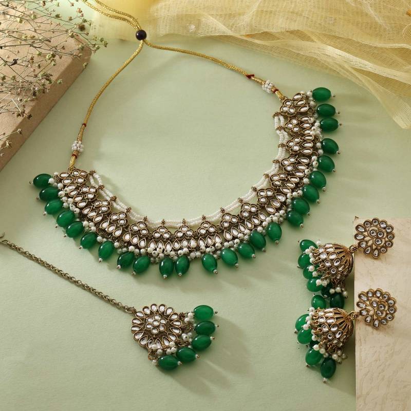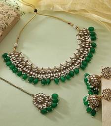| Product Description | Adjustable Rope | N: 18.00 Cm X Width: 3.70 Cm | Earring Length: 6.00 Cm X Width: 2.60 Cm | Maang Tikka Length: 13.50 Cm X Width: 3.00 Cm | Metal: Alloy With Good Quality Mehandi Gold Plated | Color: Green | Stone: Kundan & Imitation Pearl | Gross Weight: 117.00 Grams | Package Content: 1 Piece Of Necklace/1 Pair Of Earrings/1 Piece Of Maang Tikka | Back Finding: Post With Friction Back X Earring Style: Jhumka |