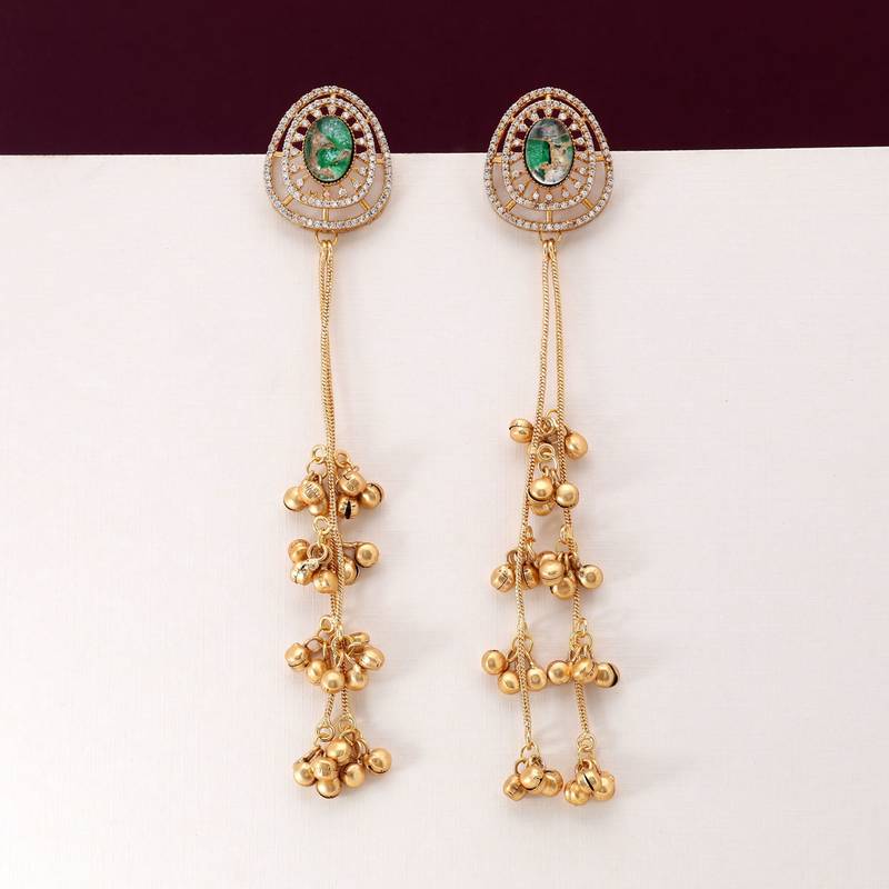 | Product Description | Earring Length: 15.00 Cm X Width: 2.60 Cm Metal: Brass With Good Quality Gold Plated | Color: Green | Stone: American Diamond & Monalisha Stone | Gross Weight: 33.00 Grams | Package Content: 1 Pair Of Earring | Back Finding: Post With Friction Back | Earring Style: Drop |