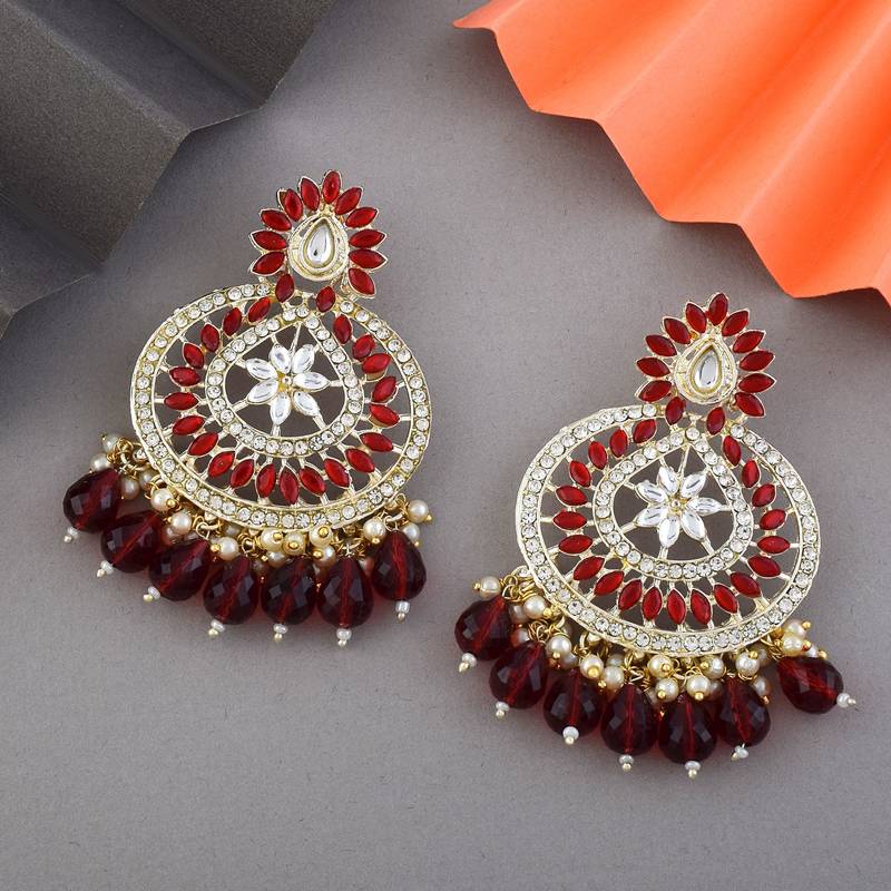 | Product Description | Earring Length: 6.50 Cm X Width: 4.00 Cm | Metal: Alloy With Good Quality Gold Plated | Color: Maroon | Stone: Kundan & Imitation Pearl | Gross Weight: 34.00 Grams | Package Content: 1 Pair Of Earrings | Back Finding: Post With Friction Back X Earring Style: Dangle |