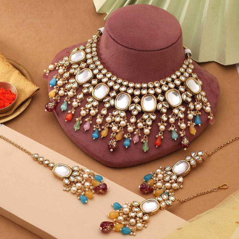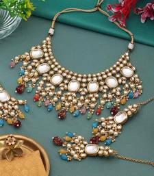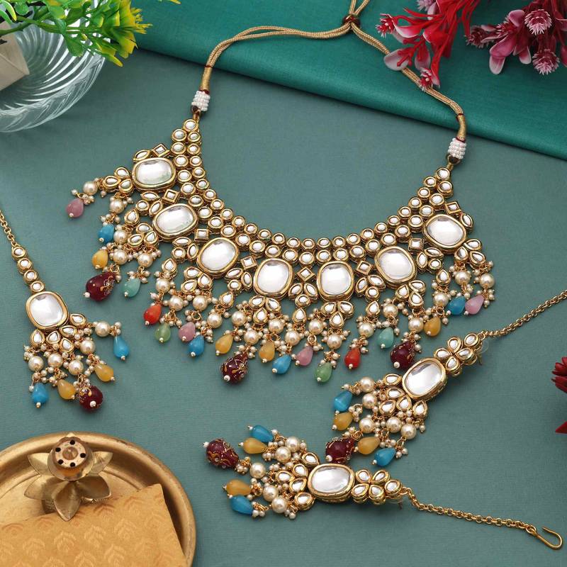 | Product Description | Adjustable Rope | N: 18.00 Cm X Width: 9.00 Cm | Chain Length: 7.50 Cm | Earring Length: 10.00 Cm X Width: 3.00 Cm | Maang Tikka Length: 18.00 Cm X Width: 3.00 Cm | Metal: Brass With Good Quality Gold Plated | Color: Multi | Stone: Kundan & Monalisa Stone | Gross Weight: 315.00 Grams | Package Content: 1 Piece Of Necklace/1 Pair Of Earrings/1 Piece Of Maang Tikka | Back Finding: Post With Friction Back X Earring Style: Dangle |