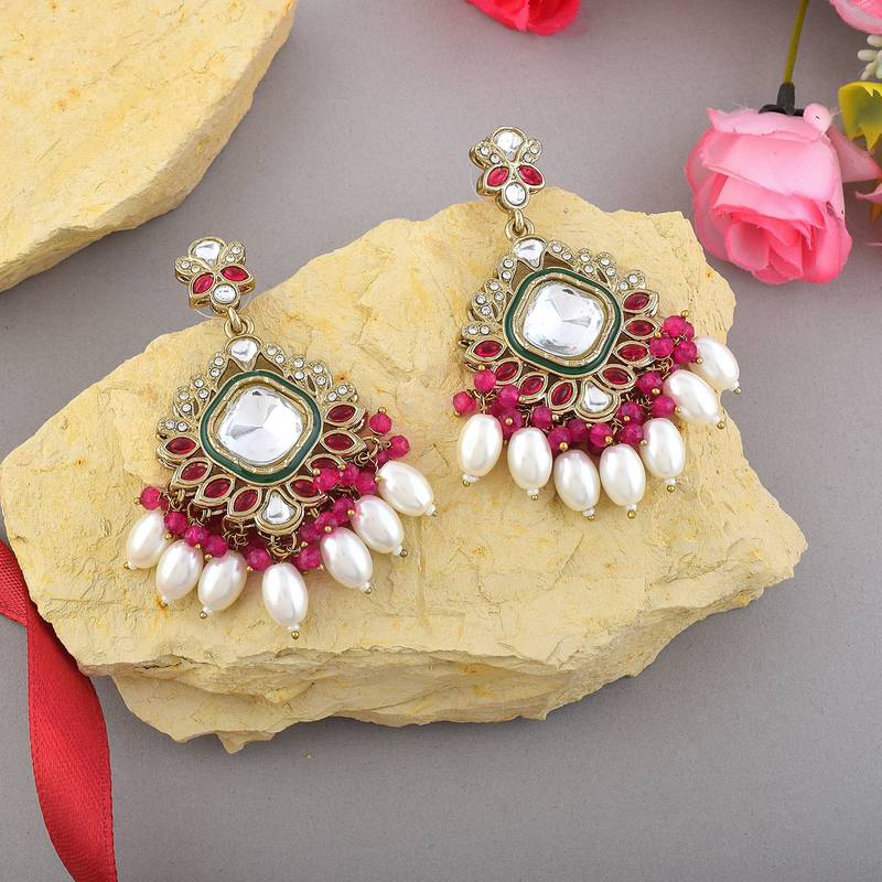 | Product Description | Earring Length: 7.50 Cm X Width: 3.70 Cm | Metal: Alloy With Good Quality Gold Plated | Color: Rani | Stone: Kundan & Imitation Pearl | Gross Weight: 39.00 Grams | Package Content: 1 Pair Of Earrings | Back Finding: Post With Friction Back X Earring Style: Dangle |
