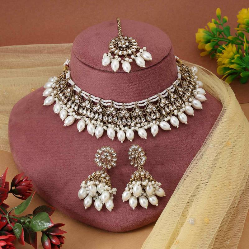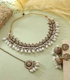 | Product Description | Adjustable Rope | N: 18.00 Cm X Width: 3.70 Cm | Earring Length: 6.00 Cm X Width: 2.60 Cm | Maang Tikka Length: 13.50 Cm X Width: 3.00 Cm | Metal: Alloy With Good Quality Mehandi Gold Plated | Color: White | Stone: Kundan & Imitation Pearl | Gross Weight: 117.00 Grams | Package Content: 1 Piece Of Necklace/1 Pair Of Earrings/1 Piece Of Maang Tikka | Back Finding: Post With Friction Back X Earring Style: Jhumka |