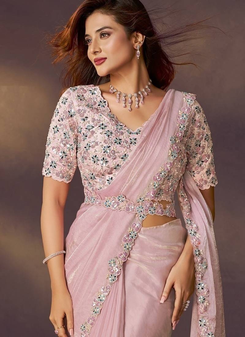 | Product Name | Baby Pink Satin Silk Blend Dual Sequins Embroidery, Mirror, Pearl Handwork With Designer Blouse & Belt Party Wear Saree | |