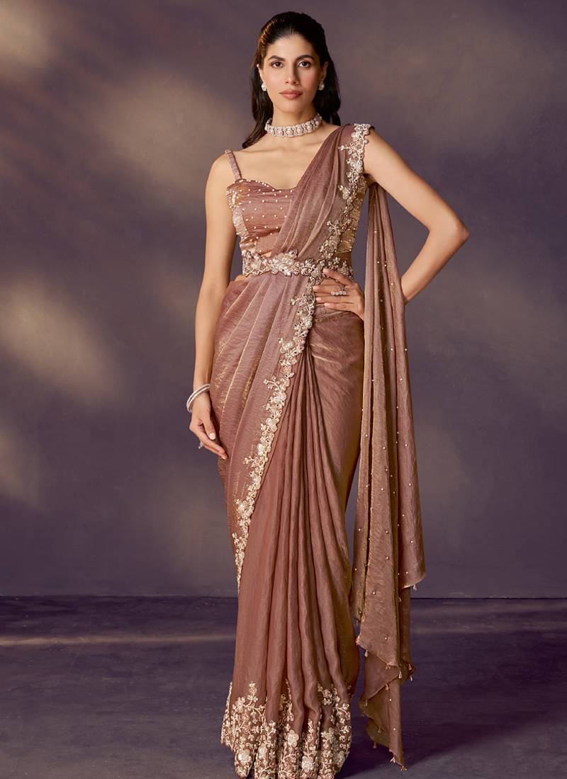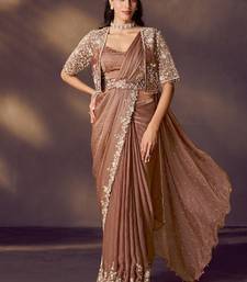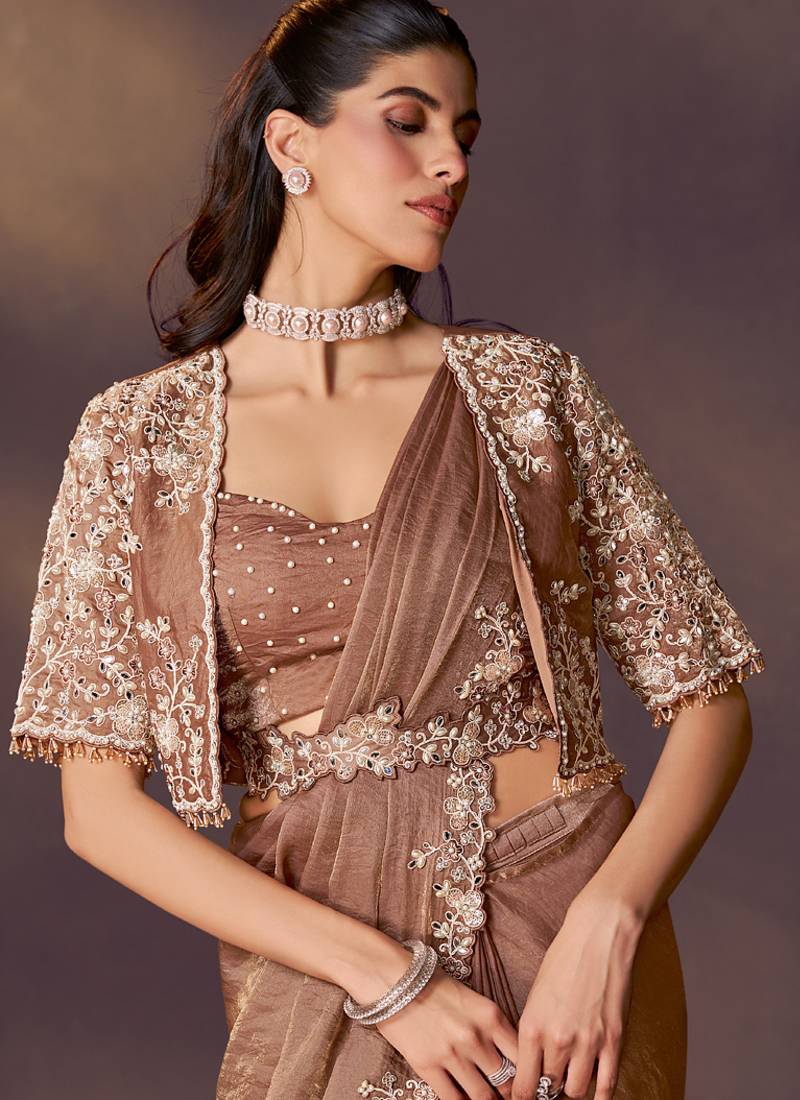 Brown satin silk blend sequins embroidery, stone, pearl embellishment work with blouse, jacket, belt ready to wear saree