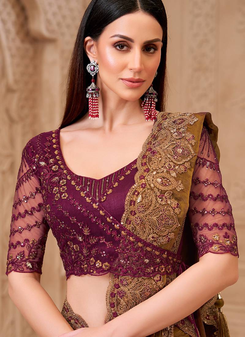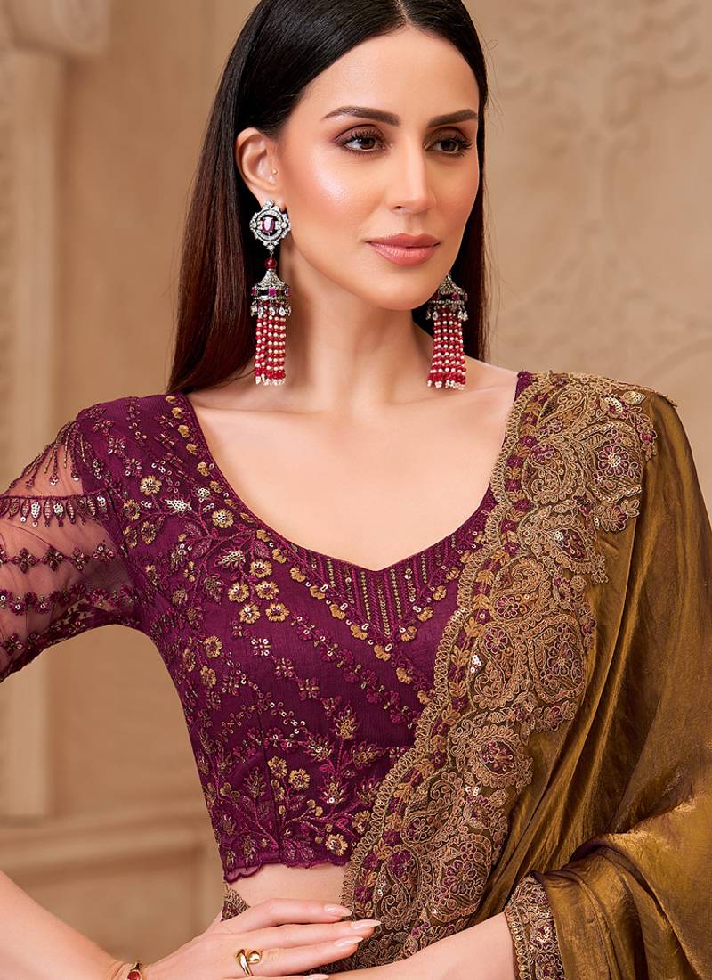 Dark golden satin georgette brocade silk blend with net designer blouse party wear saree