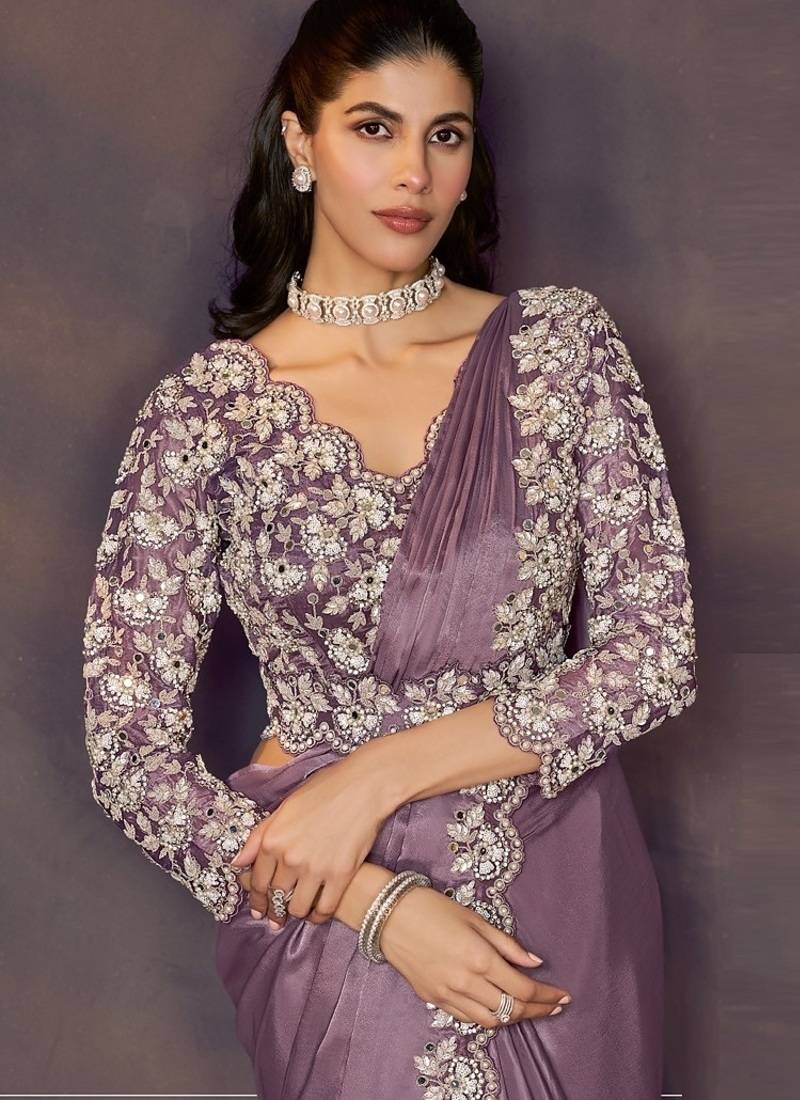| Product Name | Mauve Satin Silk Scallop Sequins Embroidery, Multi Stone Embellishment With Desigenr Blouse & Belt Ready To Wear Saree | |