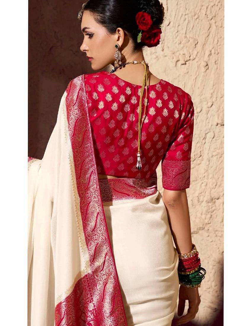 Off white & red viscose silk blend with zari weaving & tassel with brocade blouse