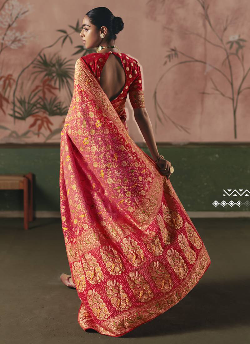 Red khadi georgette with designer weaving work & beautiful tassels bandhani saree