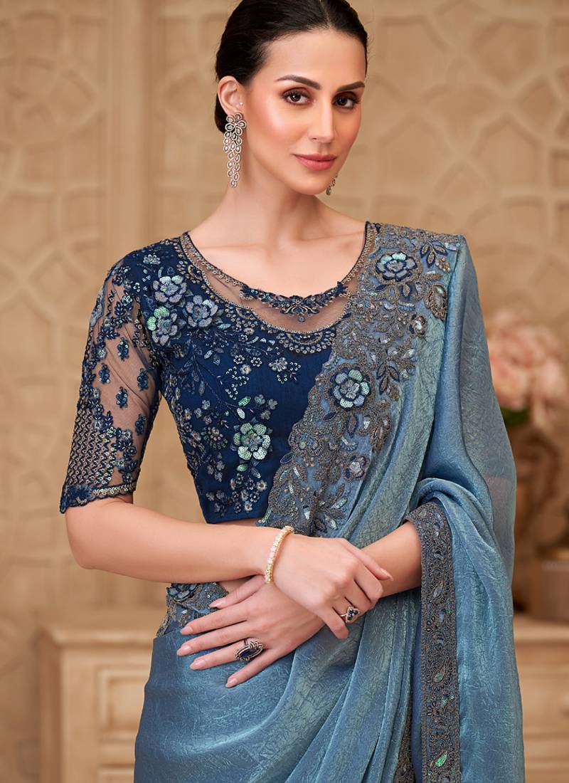 Sky blue satin crush georgette sequince & reasham work tussar silk blend net designer blouse party wear saree