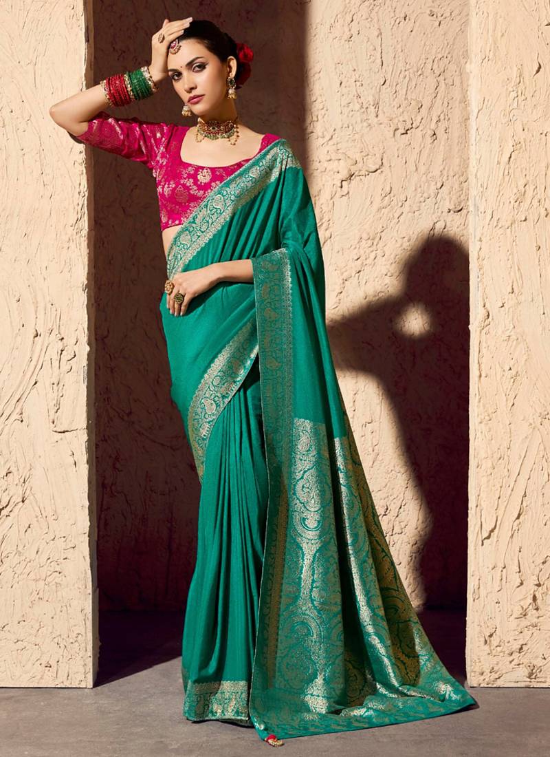 Turquoise viscose silk blend with zari weaving & tassel with brocade blouse