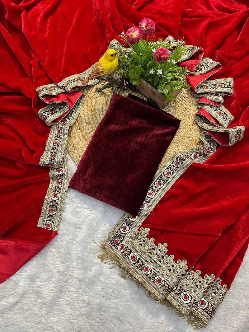 | Product Name | Red 9000 Velvet With Embroidered Work Saree With Unstitched Blouse | |