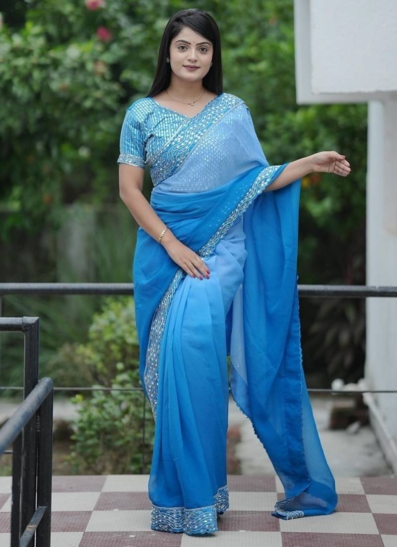 Royalblue faux georgette with real mirror work lace border saree with blouse