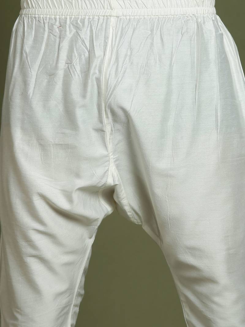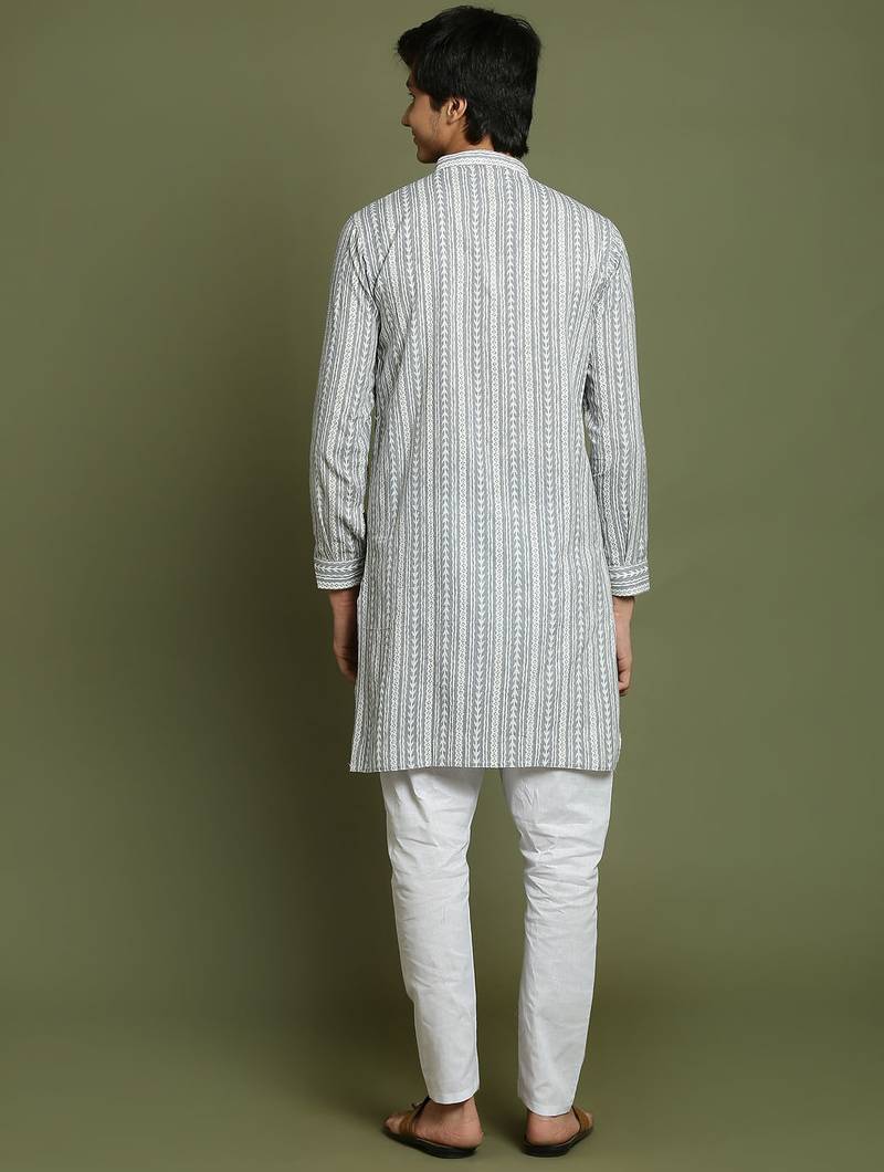 Grey Woven Straight Knee Length Kurta, Has A Mandarin Collar, Long Sleeves, Button Placket With Wooden Buttons And Loops, Straight Hem And Side Slits. Comes With Cotton Pant Style Pyjama In White Color, Has Full Length, Partially Elasticated Waist Band And Side Pockets.