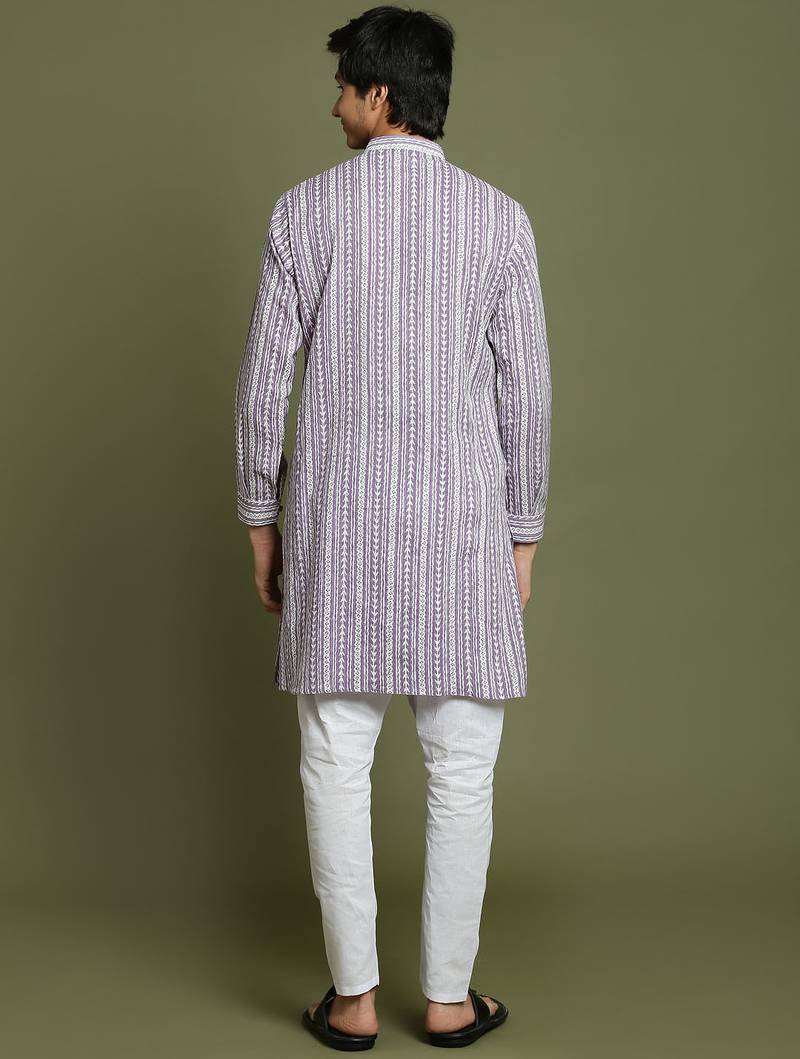 | Product Description | Purple Woven Straight Knee Length Kurta, Has A Mandarin Collar, Long Sleeves, Button Placket With Wooden Buttons And Loops, Straight Hem And Side Slits. Comes With Cotton Pant Style Pyjama In White Color, Has Full Length, Partially Elasticated Waist Band And Side Pockets. |