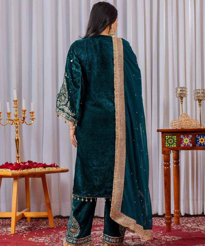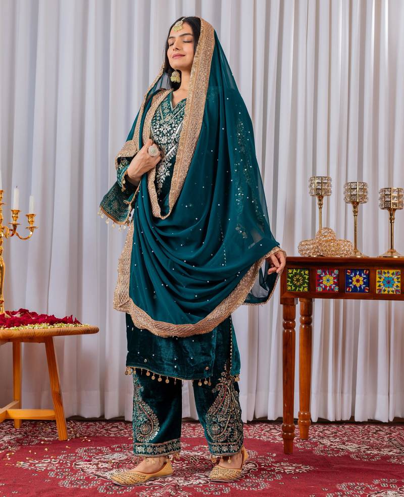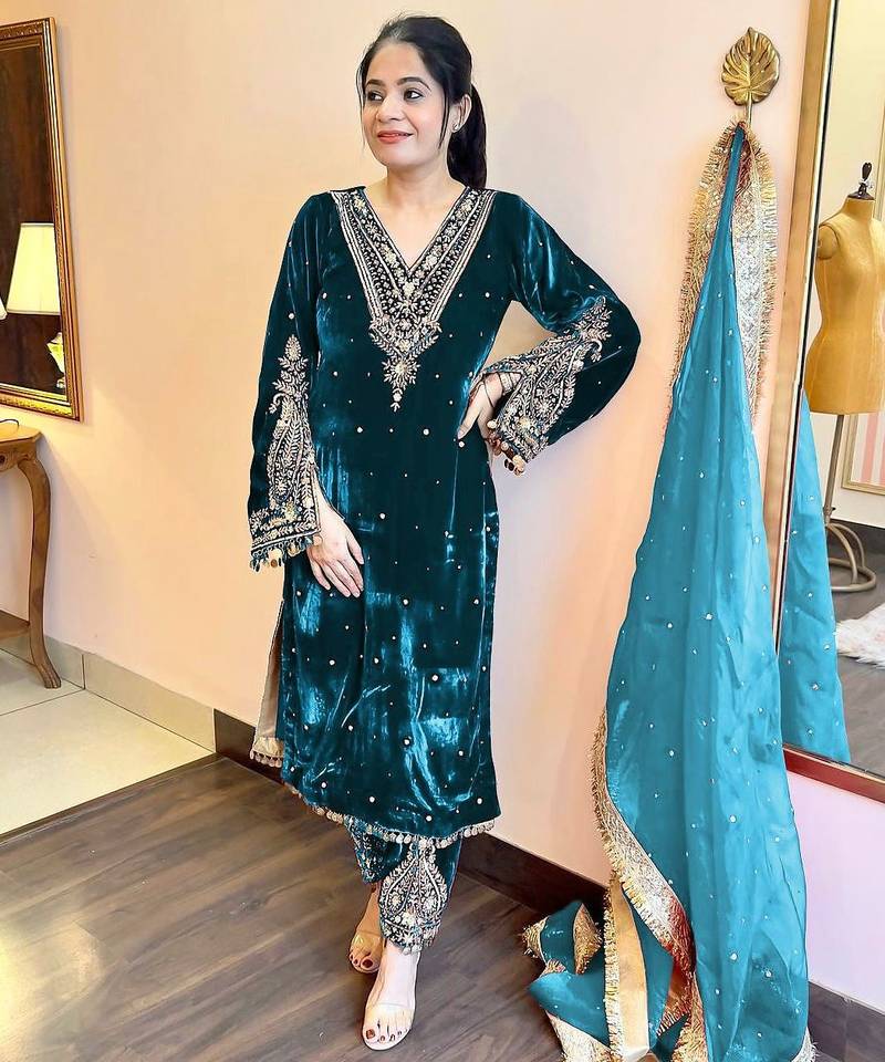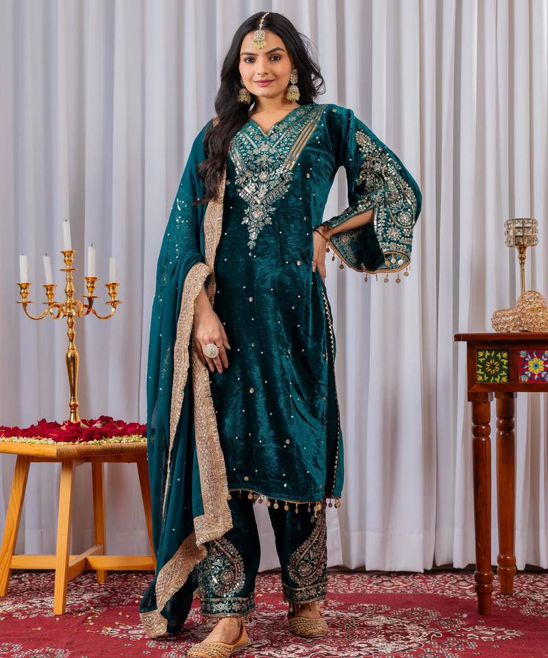 | Product Name | Women Straight Deep Teal Velvet Embroidery Kurta Set | |