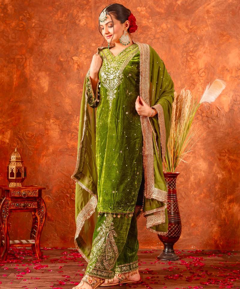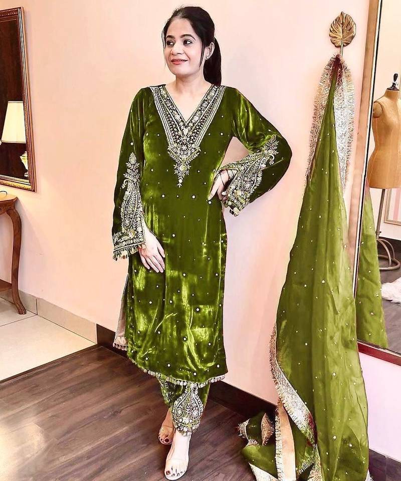 | Product Name | Women Straight Olive Green Velvet Embroidery Kurta Set | |