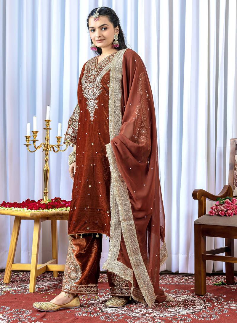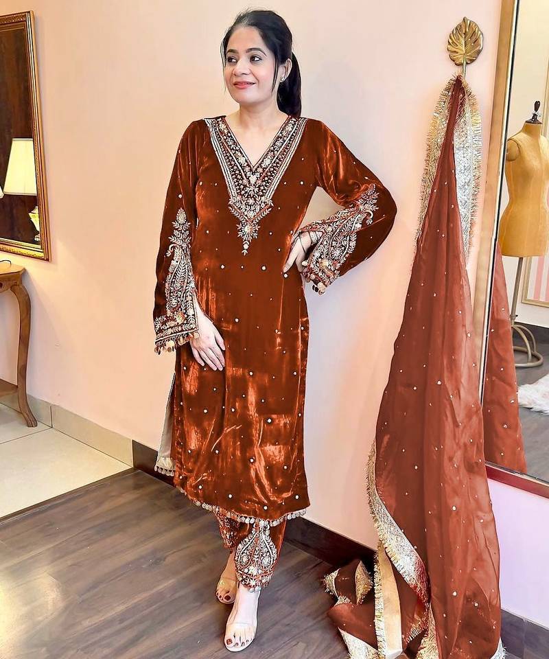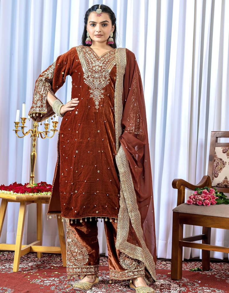 Product Name Women Straight Rust Brown Velvet Embroidery Kurta Set