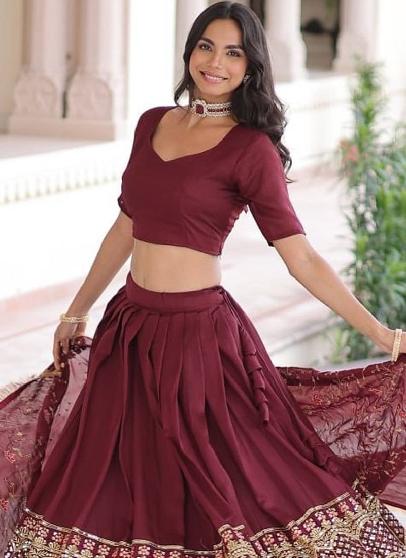 Maroon embroidered silk flared lehenga with unstitched blouse and dupatta