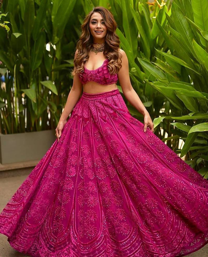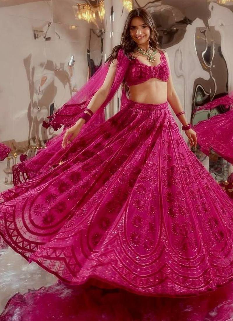 Pink kasturi silk thread sequins dori work lehenga with velvet blouse and net dupatta set – with blouse