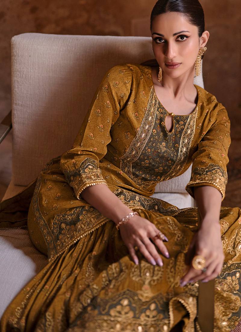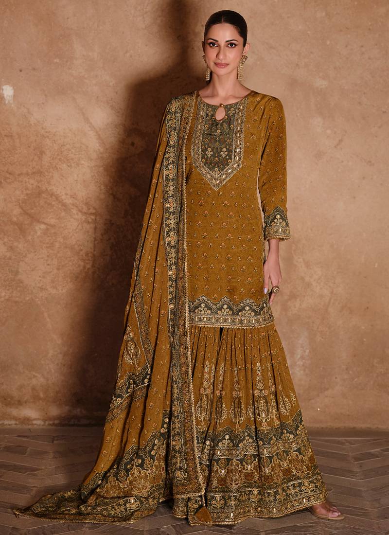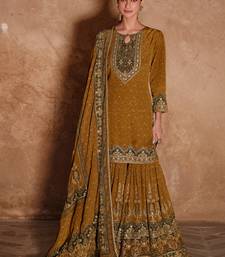 Latest wedding wear russian silk mustard gharara suit for women semi stitched