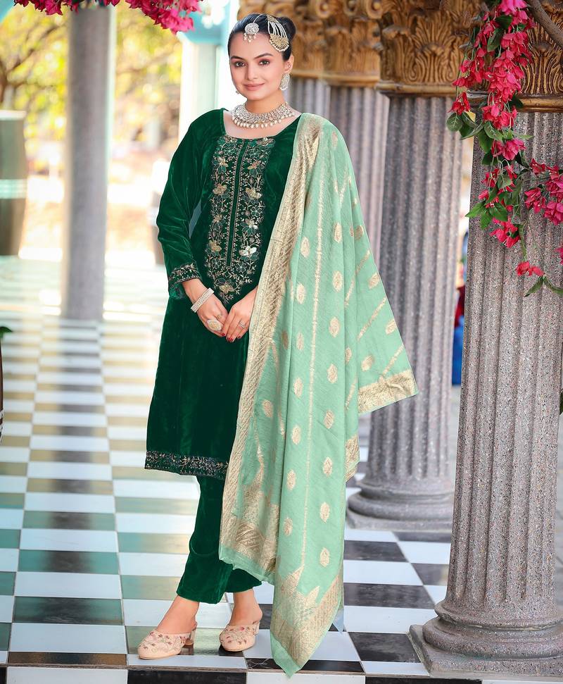 Green color velvet fabric heavy wedding ceremonial salwar kameez semi stitched