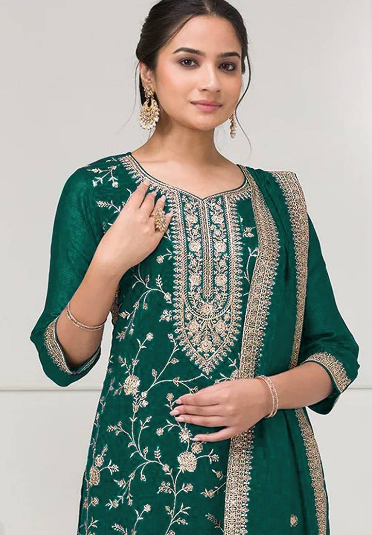 Green color vichitra silk fabric designer embroidery work sharara dress semi stitched