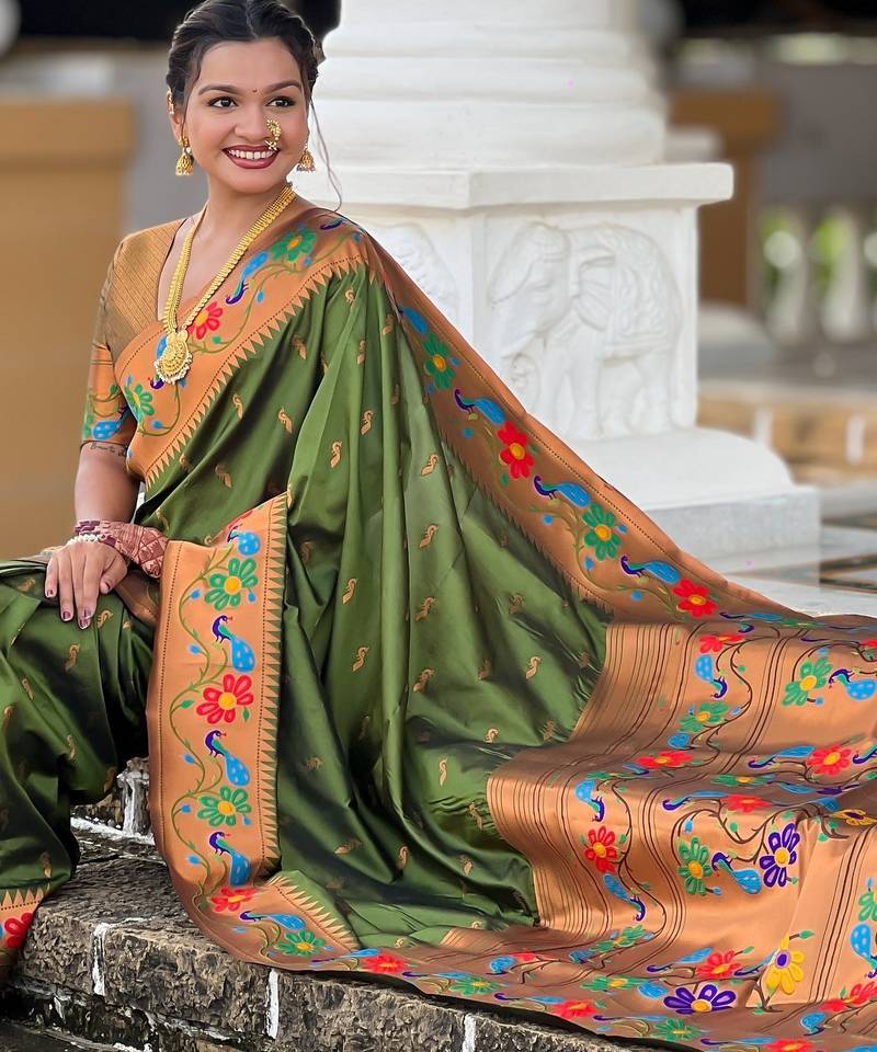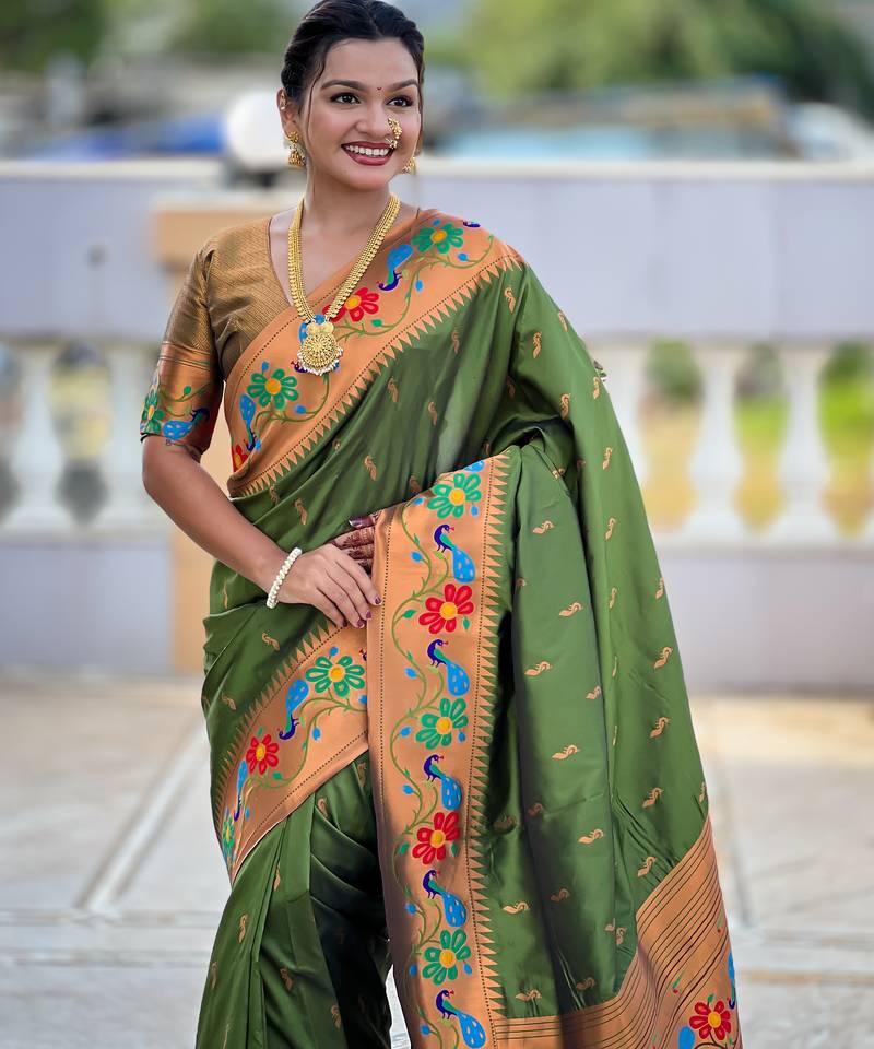 Mahendi color woven meenakari jacquard designer paithani silk blend fabric ethnic saree