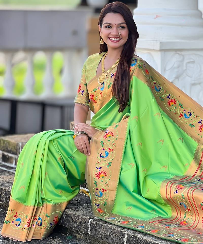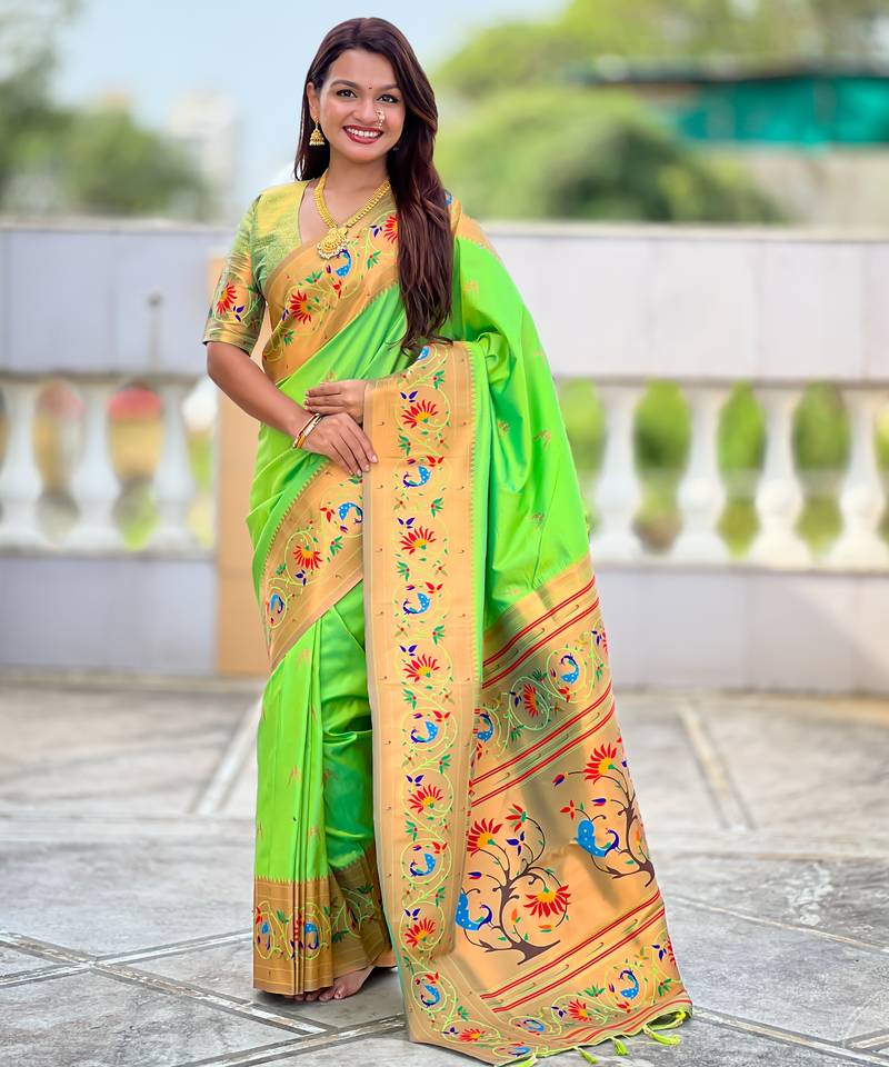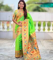 Parrot green color paithani silk blend fabric woven meenakari jacquard designer graceful wedding saree