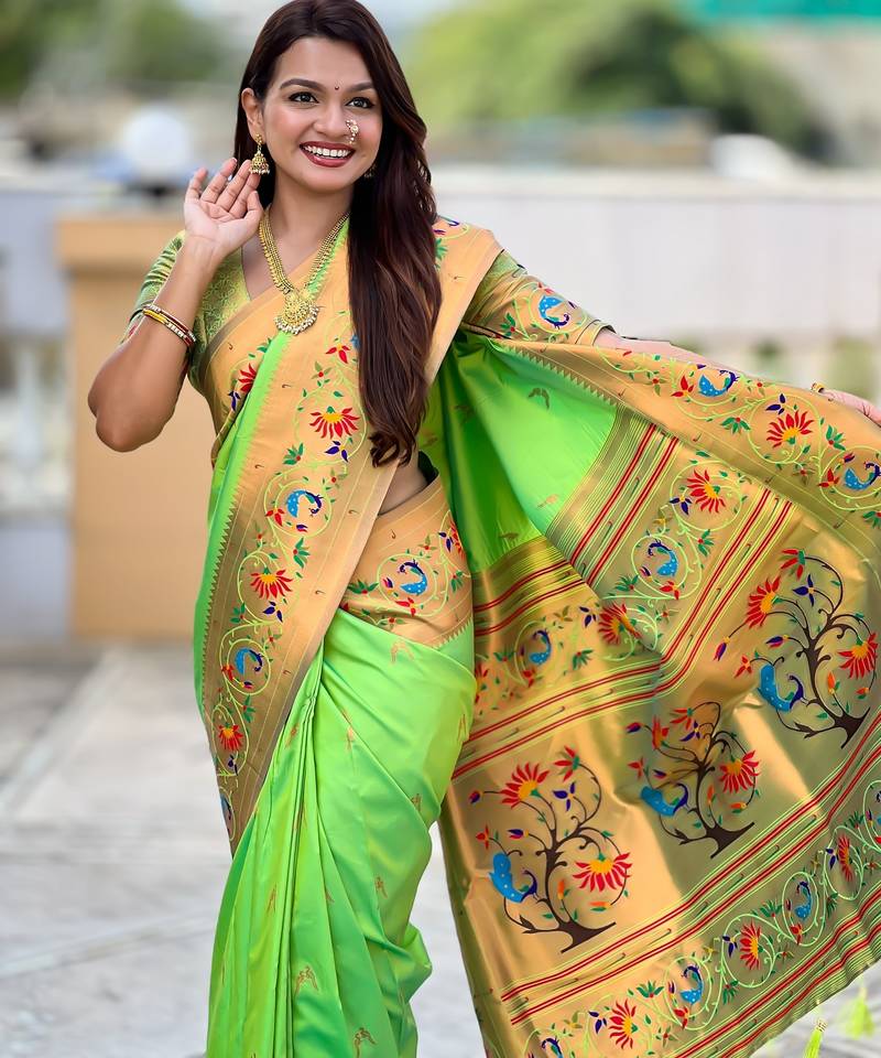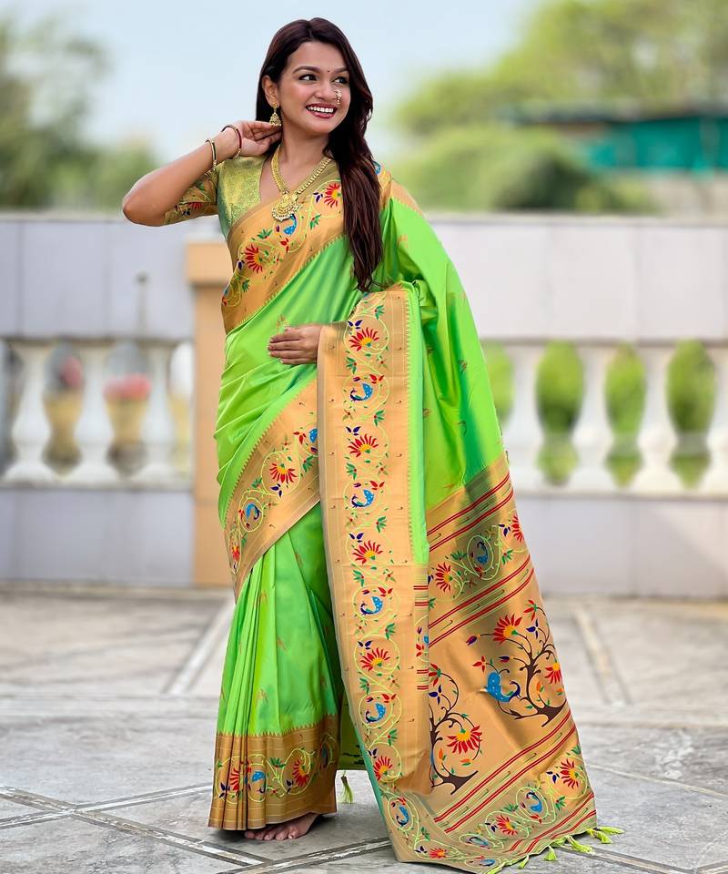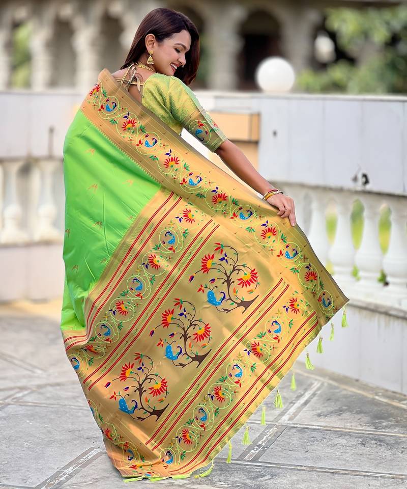 | Product Name | Parrot Green Color Paithani Silk Blend Fabric Woven Meenakari Jacquard Designer Graceful Wedding Saree | |