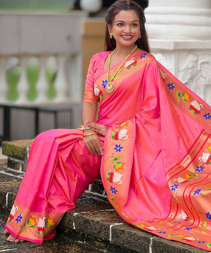 Pink color paithani silk blend woven meenakari jacquard designer heavy wedding special saree