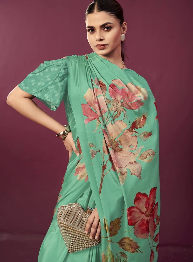 | Product Name | Sea Green Color Malai Crepe Silk Fabric Designer Digital Printed Ceremonial Partywear Saree | |