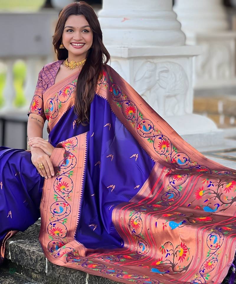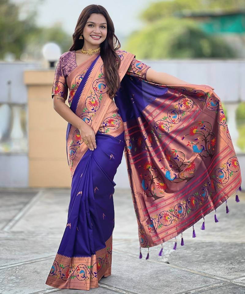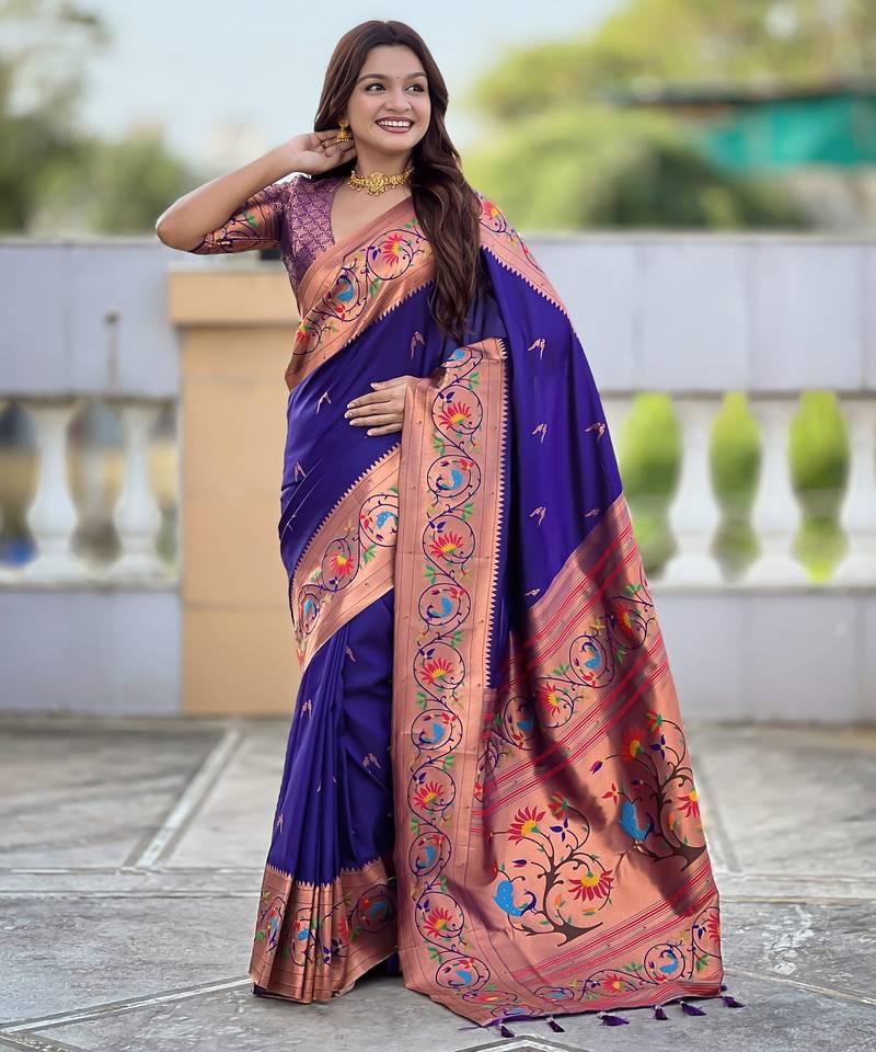 Violet color paithani silk blend fabric woven meenakari jacquard designer graceful wedding saree