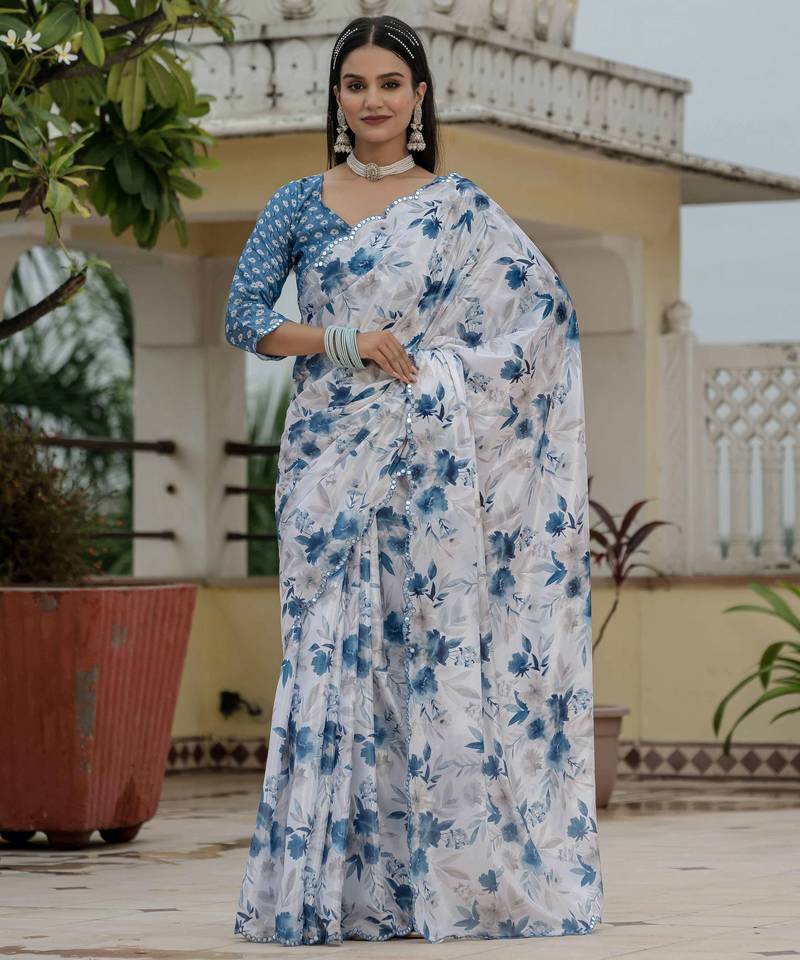 White color graceful chinon fabric smart girlie printed ready to wear saree