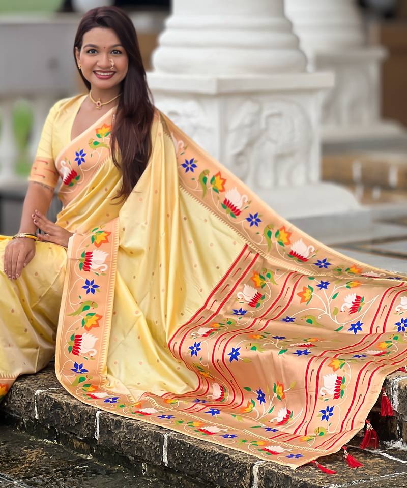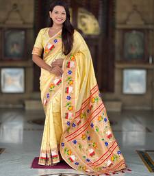 Cream faux banarasi silk blend saree with paithani rich weaved pallu and blouse