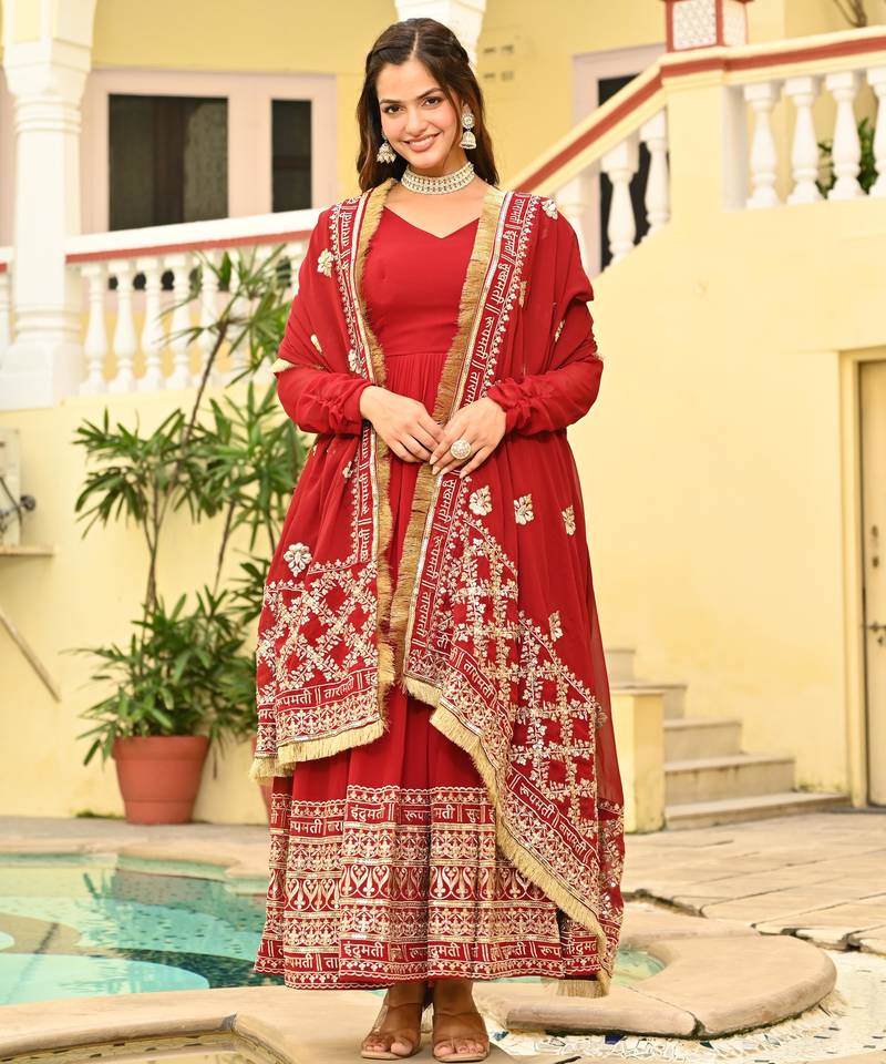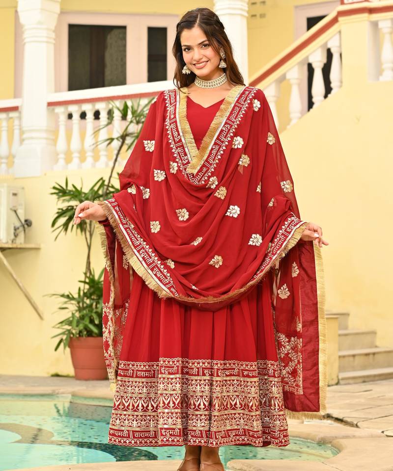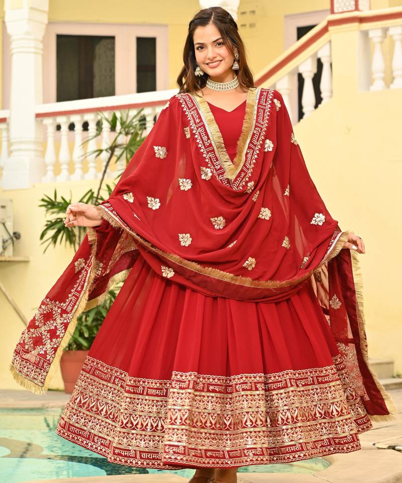 | Product Name | Red Designer Georgette Gown Dupatta With Embroidery Zari Sequins Work | |