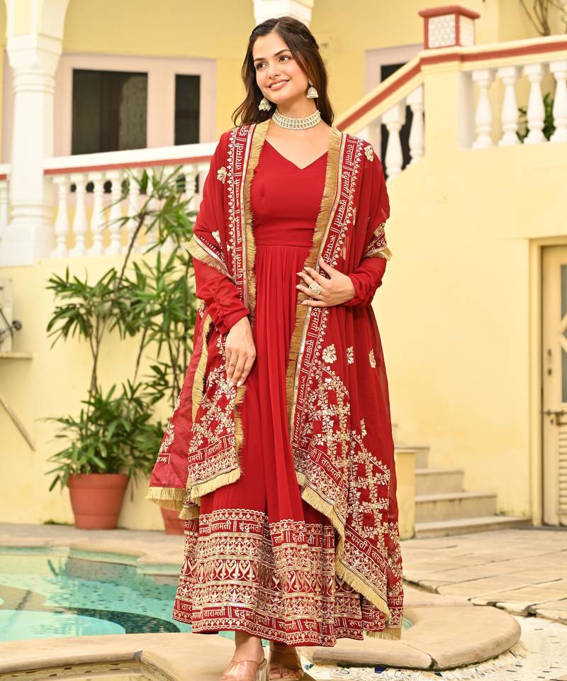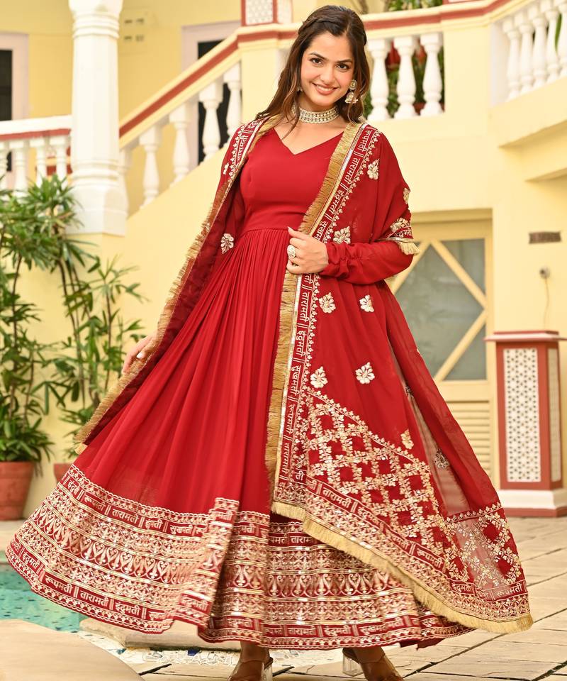 Red designer georgette gown dupatta with embroidery zari sequins work