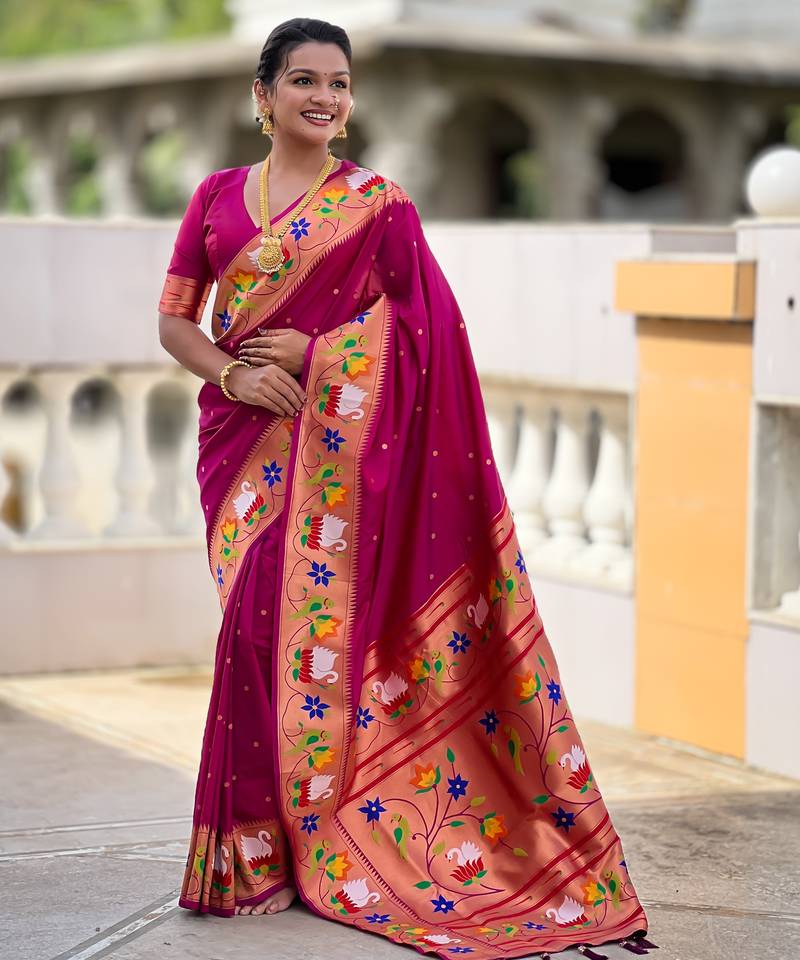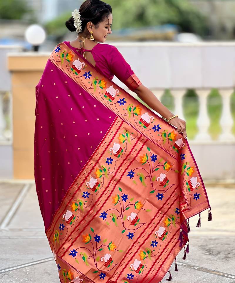 Wine faux banarasi silk blend saree with paithani rich weaved pallu and blouse