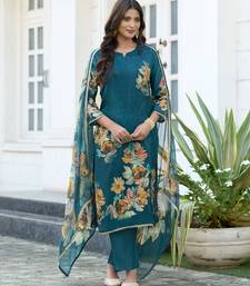 Teal blue pure ho organza floral printed straight kurta with comfort fitting pant & printed dupatta stitched