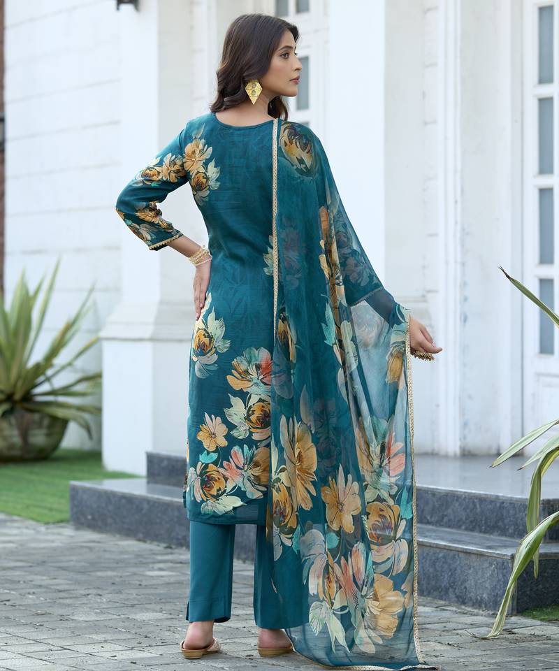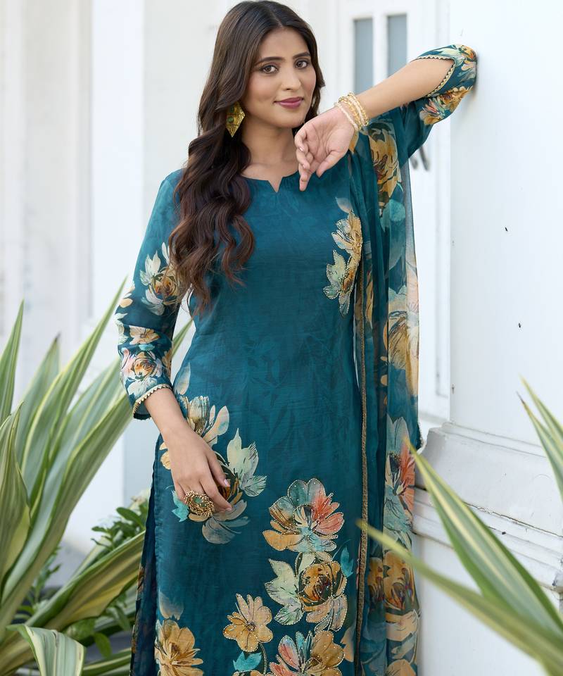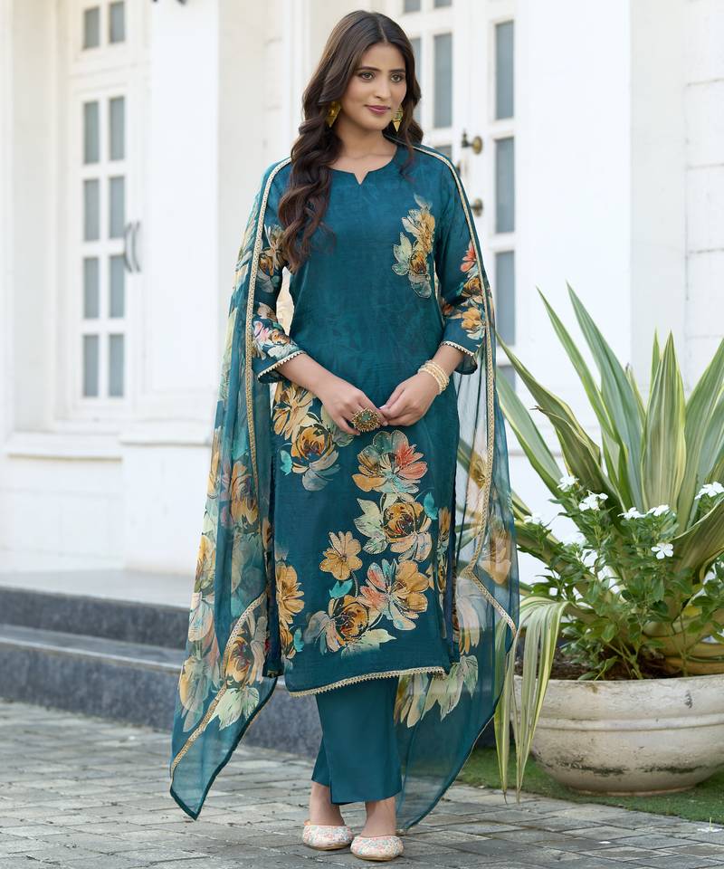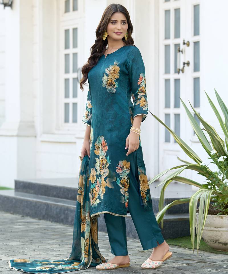 | Product Name | Teal Blue Pure Ho Organza Floral Printed Straight Kurta With Comfort Fitting Pant & Printed Dupatta | |