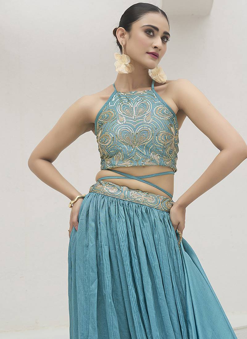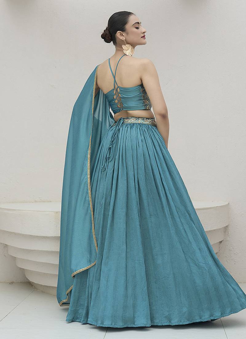 | Product Description | Elevate Your Festive Look With This Sky Blue Silk Crush Lehenga Choli, Designed With A Pleated Silhouette That Adds Graceful Volume. The Shining Fabric Is Adorned With Exquisite Sequin And Zari Embroidery, Beautifully Highlighted With An Embroidered Waist Belt For A Refined Touch. The Flared Hemline Enhances The Elegance, While The Set Is Completed With A Matching Dupatta Detailed With Delicate Lace Edging, Making It A Perfect Pick For Weddings, Festive Celebrations, And Grand Occasions. (Note Lehenga Comes Stitched In 42 Size, Blouse Comes Unstitched & Dupatta Size Comes In 2 Mtr.) |