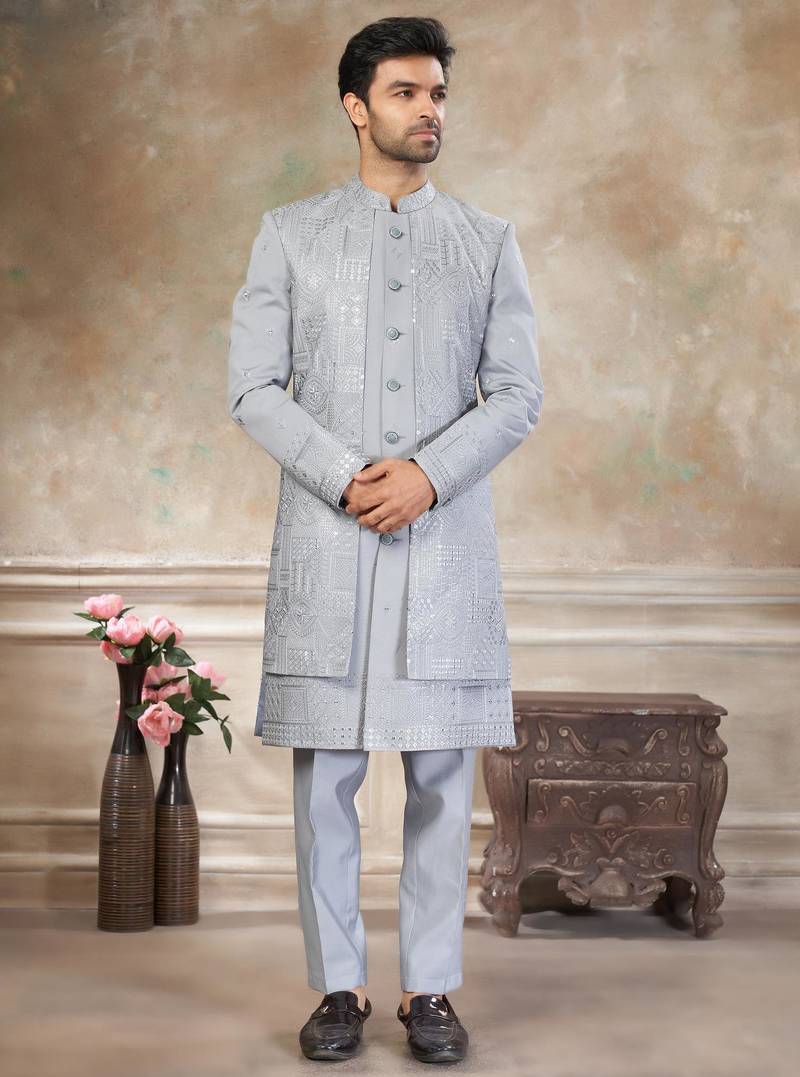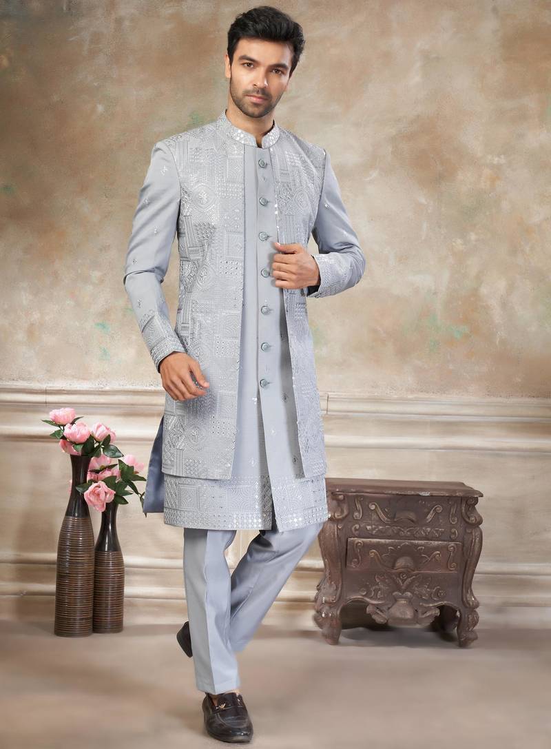 Grey pure viscos with embroidery and sequence work indowestern collections
