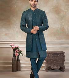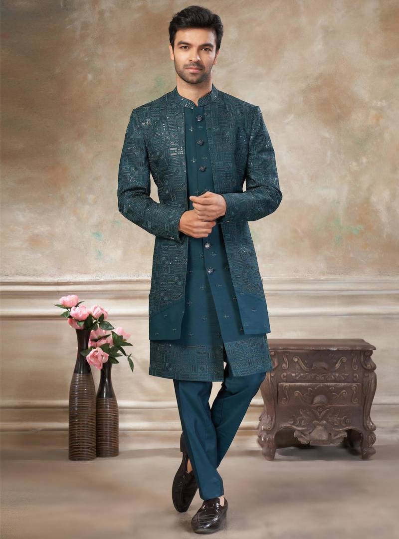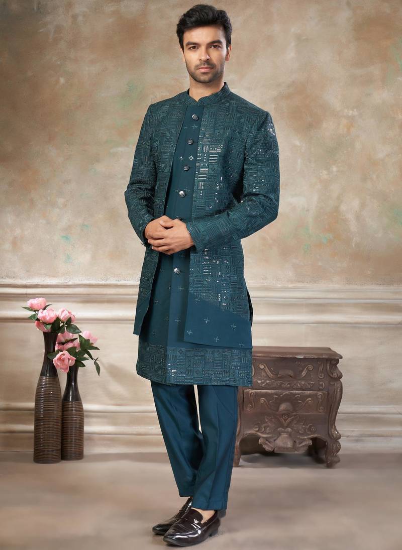 Teal blue pure viscos with embroidery and sequence work indowestern collections