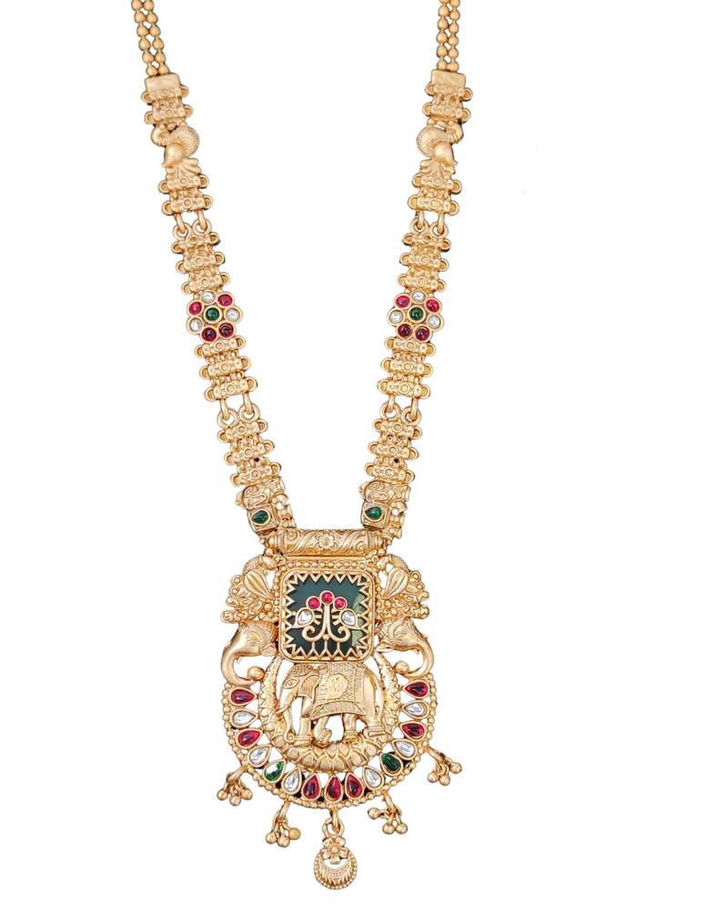 | Product Description | This Antique Gold Plated Temple Necklace Set Features A Grand Elephant Motif Pendant Adorned With Ruby, Emerald, And Kundan Style Stones. Its Intricate Craftsmanship And Traditional Carvings Give A Regal, Ethnic Look. Paired With Matching Earrings, It Is Perfect For Weddings, Festive Occasions, And Cultural Events, Adding Elegance And Heritage Charm To Any Outfit |