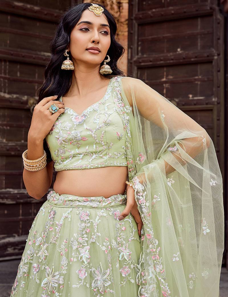 Limegreen net fabric sequins embroidery semi stitched lehenga & unstitched blouse with dupatta